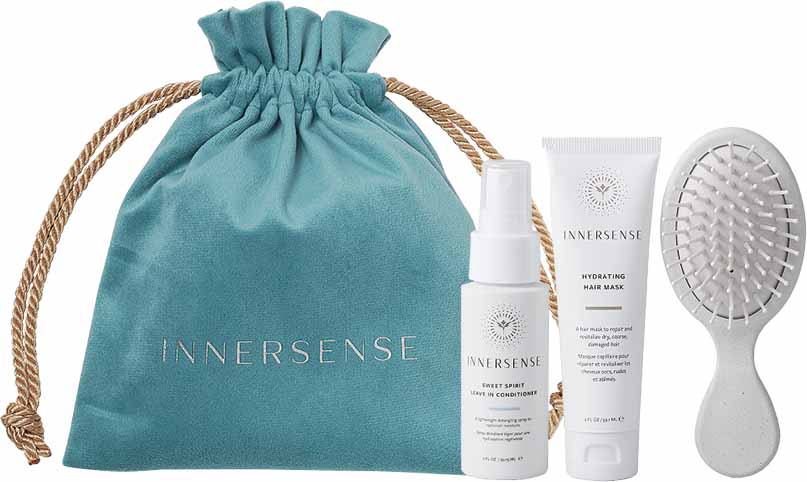 ブランド人気No.1の洗い流さないトリートメントと、週1のスペシャルケア用ヘアマスクのトラベルサイズに、ミニクッションブラシとベロア巾着のセット。
