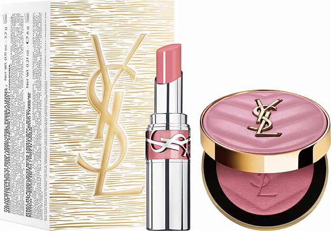 「YSL メイクミー ブラッシュ パウダー」と「YSL ラブシャイン リップスティック」の人気色(ともに44番)を、リッチなゴールドボックスにイン。