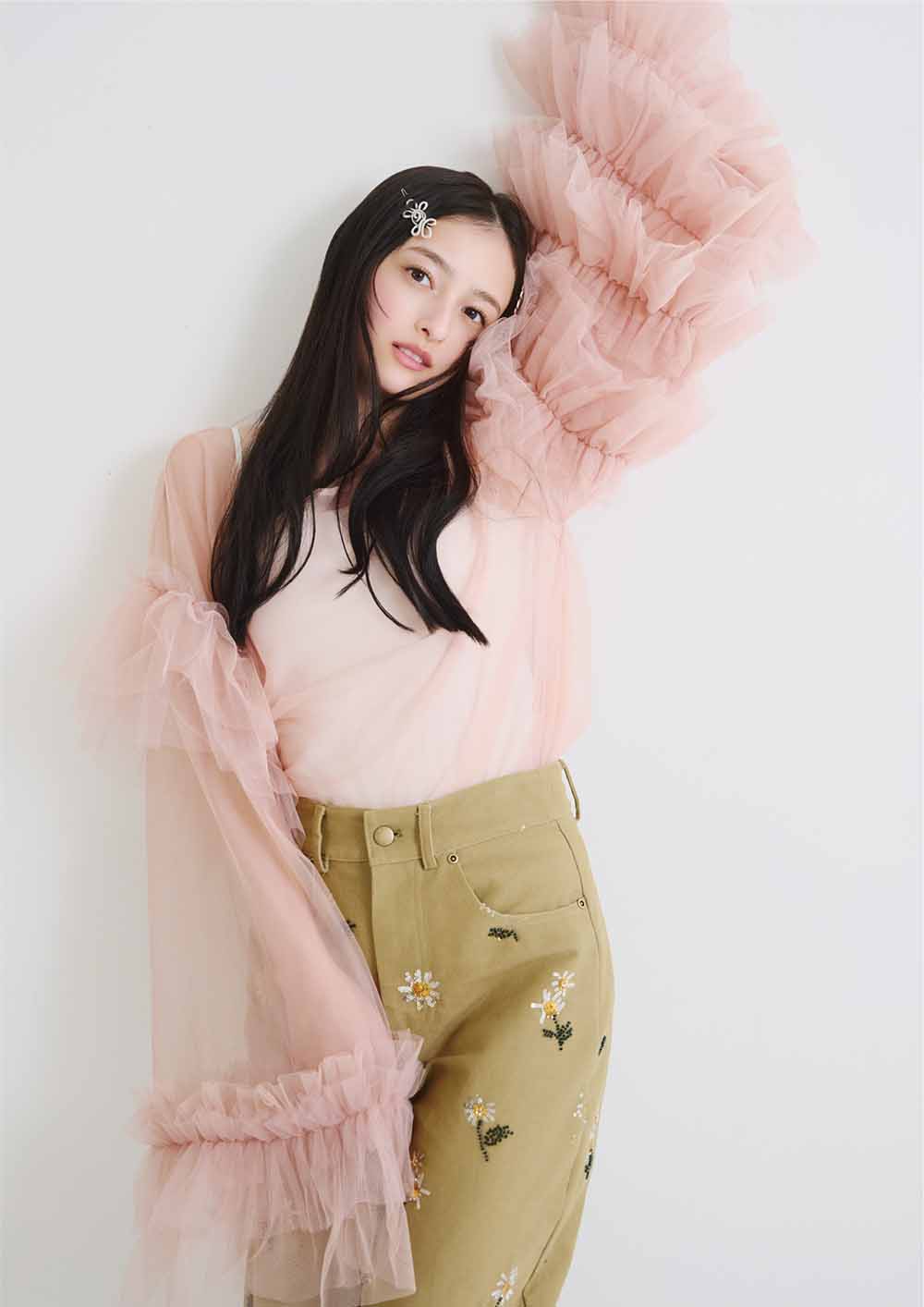 ピンクチュールトップス ¥9,900/LA BELLE ETUDE(アンティローザ)、カーキ花柄スパンコールパンツ ¥39,380/DREAM SISTER JANE(THE WALL SHOWROOM)、ヘアピン(2個セット)¥1,870/GOLDY、中に着たキャミソール/スタイリスト私物