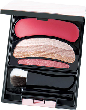まぶたベースをなじませたら、ブラシで3色シャドウを一気塗り。新色は、トレンドの赤み系メイクが楽しめる配色。