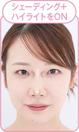 ハイライトを眉間、鼻の頭に、シェードカラーを目頭にくの字、鼻の頭にUの字を描くようにのせて。