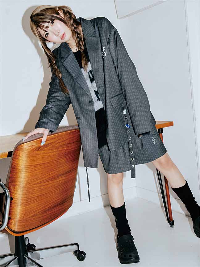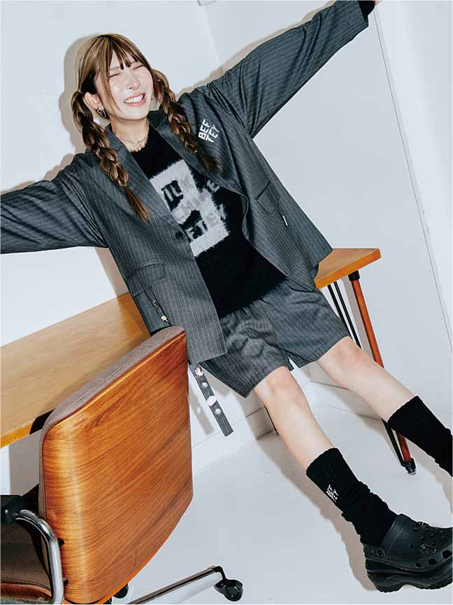 ジャケット ¥16,500、ハーフパンツ ¥12,100、ニット ¥11,000、ルーズソックス ¥2,728(全て参考価格)、その他まあたそ私物